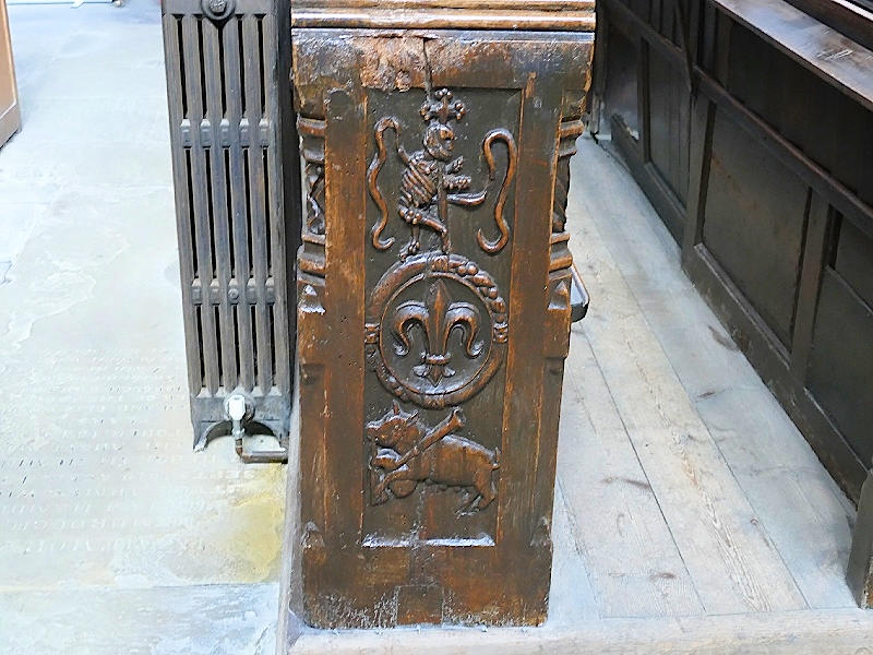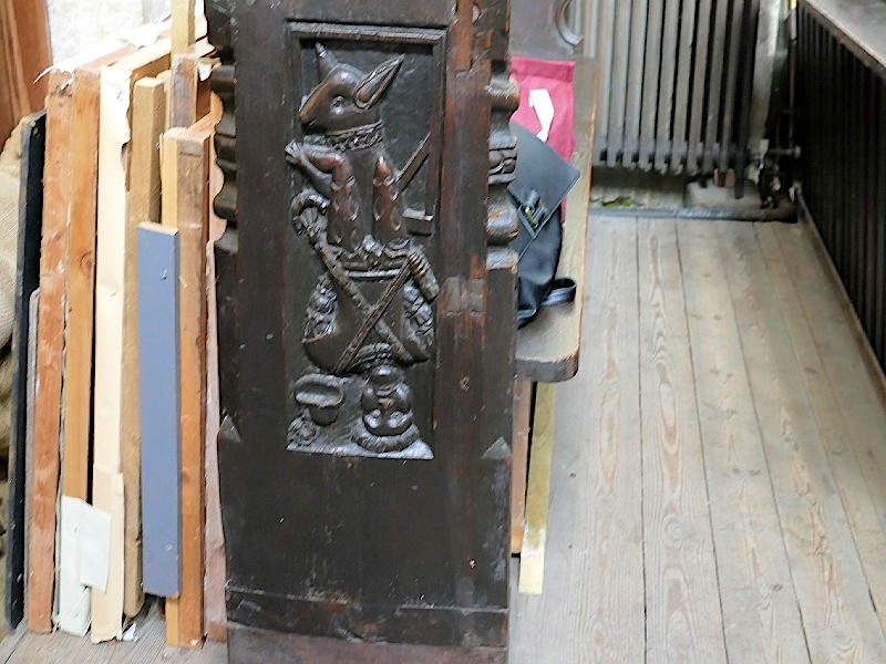 Two views of misericords - 1, 2, and a charming wall-painted "prayer for errant bell-ringers", as John describes it, all © John Balaam (2011).