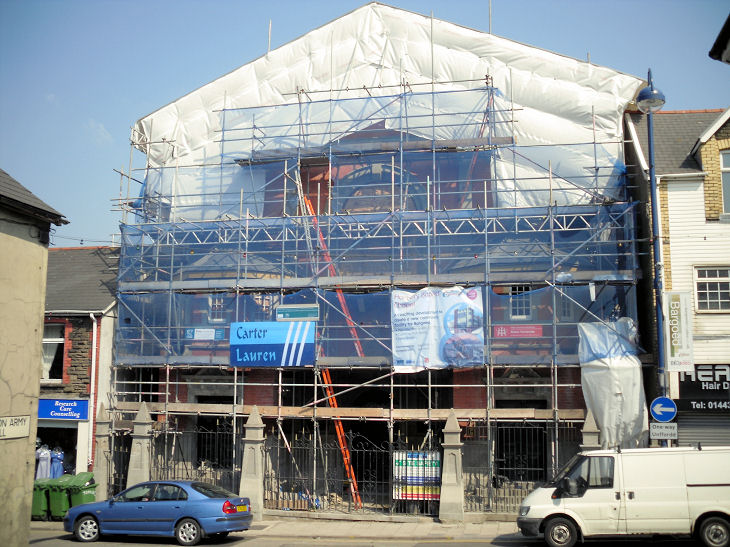 Bargoed, Caerphilly The 1920 25" O.S. map shows a Chap. on Upper High Street at ST 1503 9992. This can be identified from its Coflein entry as Bethania Methodist Chapel, of 1901, a re-build of the original of 1878. There's now a car park on its site (2009 Streetview). Calfaria Welsh Independent Church on Greenfield Street. It has a date-stone for 1910, but Coflein dates it to 1874. ST 1508 9961. © Gerard Charmley (2011). It's possible that the 1910 date is the correct one since the 6" O.S. map of 1901 shows another Capel Calfaria on High Street at ST 1510 9984. Could this be the 1874 church? In any event, it has been demolished, and a shop now stands on the site (Peacocks, in a Streetview from 2022). A Congregational Church is shown on a 1919 O.S. map on Cardiff Road at ST 1502 9930. Its Coflein entry describes it as Trinity English Independent Chapel. Streetview saw it in 2022, and the symbol on the wall suggests it's now a Masonic Hall. Ebenezer Gospel Hall is (or stands on the site of) a Baptist Chapel, shown on older O.S. maps on Park Road at ST 1493 9961. The 25" O.S. map from 1920 marks a Church on South Street at ST 1493 9968. I've been unable to discover anything about it, but it had been replaced by a surgery by the time of the first Streetview visit in 2009. The former Hanbury Baptist Church on Hanbury Road, undergoing conversion. Dated in its Coflein entry to 1906, it can be better seen in a Streetview from 2021. ST 1517 9973. © Gerard Charmley (2011). The derelict former Mission Church on Heolddu Road and Greenfield Street. (By 2017 it had been converted to residential use - Streetview). ST 1495 9989. © Gerard Charmley (2011). This seems to be the same building described by Genuki as Providence Chapel (Elim). St. Gwladys, on Church Place. Its Coflein entry dates it to two stages, 1877-9 and 1893-4. ST 1503 9999. © Gerard Charmley (2011). Link. St. Peter's on the Graig (R.C.) on Usk Road and Graig Terrace is dated by Coflein to 1903. ST 1491 0016. © Gerard Charmley (2011). Link. Salvation Army Hall on Greenfield Street and Upper Capel Street. ST 1501 9970. © Gerard Charmley (2011). A former Wesleyan Methodist Chapel (2022 Streetview) stands on Wood Street. It pre-dates a map of 1919. ST 1501 9947.