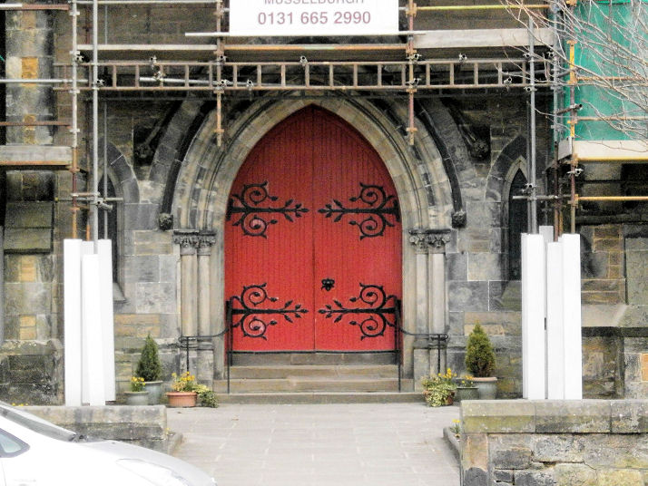 (2013). St. David (R.C., 1853-4, by Joseph Hansom) on Eskbank Road. NT 328 669. © Howard Richter (2013). Link. Grade A listed. St. John's and King's Park (CoS, 1870), currently undergoing restoration. The main door. Built as King's Park United Presbyterian, it merged with St. John's Free Church in 1912, when the latter became too small for the congregation. St. John's is believed to have been what shows as "Free Church" on an 1853 map, and on the 1907 edition as "U.F. Church", and thus on the south side of Buccleugh Street (at about NT 331 671. It was probably demolished between 1911 (when the first service in the combined church took place) and 1914, when the next map shows a "Picture Palace" on the same site. This building, or a later replacement, became the Playhouse Cinema, and is now a snooker hall. Whether any of the original church building fabric survived these changes is not known at the moment. NT 330 671. Both © Howard Richter (2013). Link1. Link2. Link3. Grade B listed. St. Mary the Virgin (Episcopal, 1843). Another view. The main door has splendid ironwork. NT 335 677. All © Howard Richter (2013). Link. Grade A listed. St. Nicholas on High Street. The ruins, better seen here, are the remains of the choir, partitioned off from the rest of the church when it was made the parish church in 1592. The roof collapsed in about 1770. Another view. NT 333 674. All © Howard Richter (2013). Link1. Link2. Grade A listed. Salvation Army hall (built - though not by its current occupiers - in 1870). Howard Richter advises that, according to "Dalkeith Since the War" (ISBN 1 84033 348 0), this was at one time a Full Gospel Church. NT 332 674. © Rob Brettle. The site of the demolished Wesleyan Methodist Church on the corner of South Street and St. Andrew's Street at NT 3322 6722. The current building on the site has been placed rather further back from the corner than the chapel. Opened for worship in 1788, by the 1950's it was in use by the Open Brethren, when it was known as Wesley Hall. It may have ceased as a Methodist Chapel on or before 1887, when another Wesleyan Chapel opened on the corner of Bonnyrigg Road and Westfield Park at NT 3223 6632. It too has been demolished, sometime after 1948, when it shows on the OS map of that year. It seems to have closed as a chapel after 1914, also from map evidence, when it is shown as "Chapel", but by 1930 when this source says - "Methodism in Dalkeith has now been defunct for many years". There appears to be no Methodist worship in Dalkeith today. The former West Kirk, also known as Buccleuch Kirk, on Old Edinburgh Road. Although completed in 1840, it didn't come into use for over 10 years - see the Grade B listing. It closed in 1989, and is now in commercial use by a joinery firm. Two additional views - 1, 2. NT 330 673. All © Howard Richter (2013).