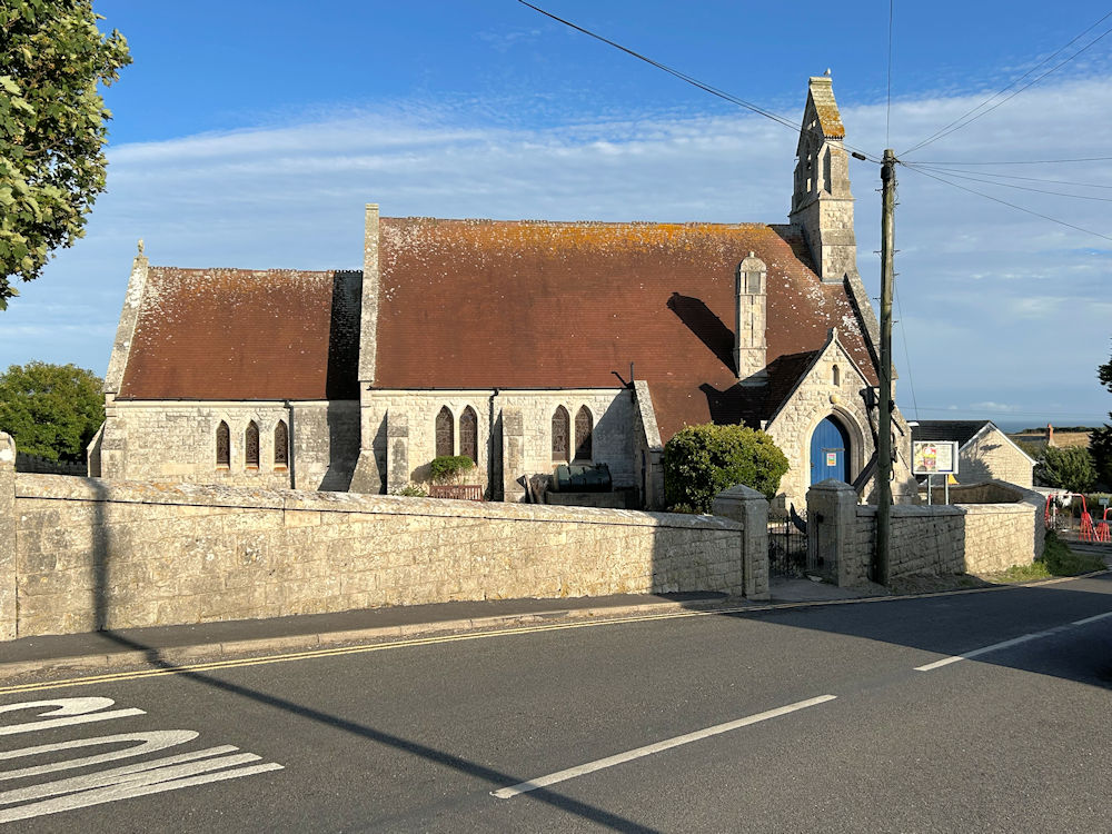 Easton Methodist Church, also home to the Salvation Army. The closer of the two buildings has a stone inscription saying "Wesleyan Schools 1878". SY 690 718. © Steve Bulman (2010). The ruins of St. Andrew, on the cliffs below Easton. Three further views - 1, 2, 3. SY 697 711. All © Steve Bulman (2010). Link. St. Andrew (1878), Southwell. SY 686 701. © Steve Bulman (2010). Another view, © Karel Kuča (2025). Link. St. George, Easton, now looked after by the Churches Conservation Trust - see link for opening times. SY 6866 7201. © Steve Bulman (2010). Another view, © Karel Kuča (2025). Link. Grade I listed, and see here for related listed features. St. John the Baptist at Fortuneswell. Hemmed in by mature trees, it is difficult to photograph well. The tower. A viewpoint further south allows another view, showing the rose window. SY 686 735. All © Steve Bulman (2010). St. Peter at Grove. Another view. SY 698 725. © Steve Bulman (2010). The former Salvation Army building on Victoria Place. Circa SY 692 721. © Steve Bulman (2010). Former Roman Catholic Church on Grove Road, Grove, now closed. SY 697 724. This is probably Our Lady and St. Andrew, mentioned in Pevsner, and if so, is of 1868. © Steve Bulman (2010). This Fortuneswell church, with the look of Non-conformity about it, was only seen from the viewpoint mentioned above (see St. John). SY 689 733. © Steve Bulman (2010). Another view, © Martin Richter (2012). Howard Richter has advised that this is Underhill Methodist Church, which was built as Wesleyan, and opened in 1899 to replace an earlier chapel. An old postcard (franked 1905) calls it Brackenbury Memorial Church. From Judy Flynn's Collection. Link. Former(?) U.R.C. on High Street, Chiswell. The Google Earth photo still shows a church notice board below the window, missing when I visited. © Steve Bulman (2010).